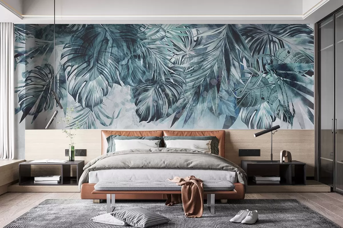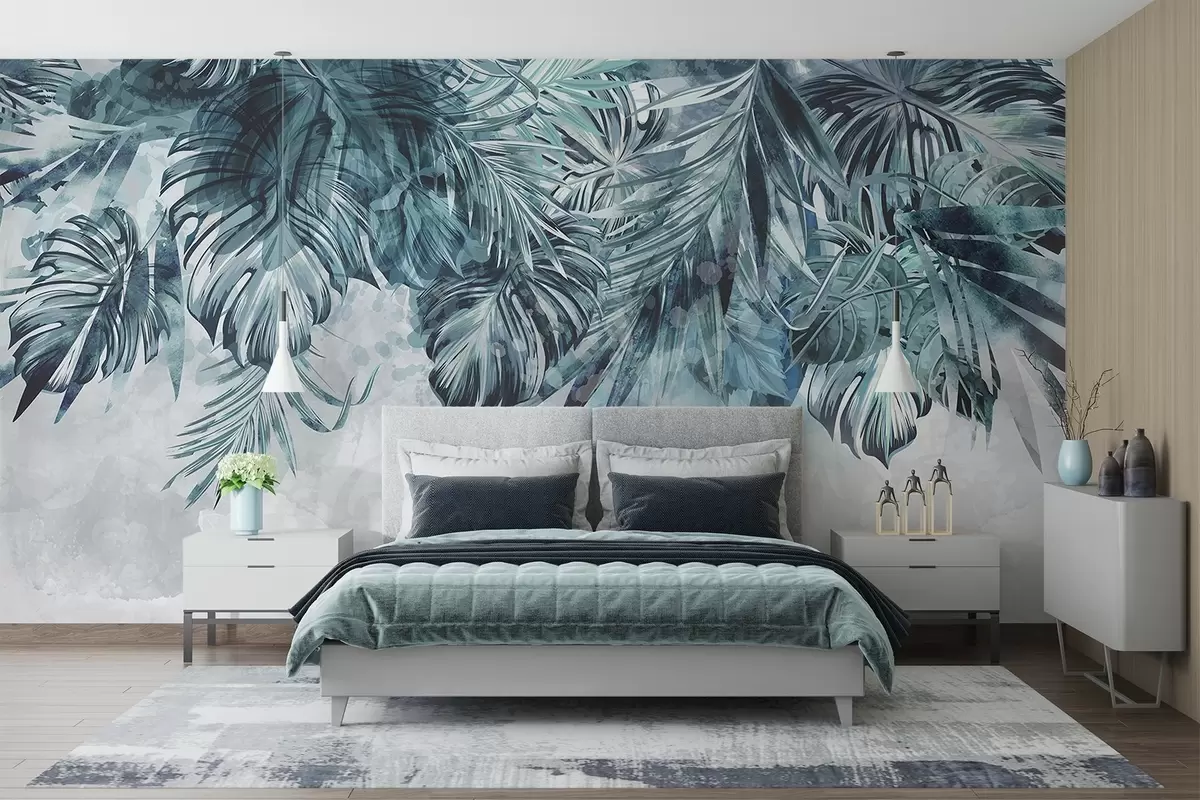 Fototapetes Tropu lapas ar tumši zilajiem un zaļajiem toņiem, kaskādēm no augšas, uz gaiša, teksturēta fona Nr. w08667