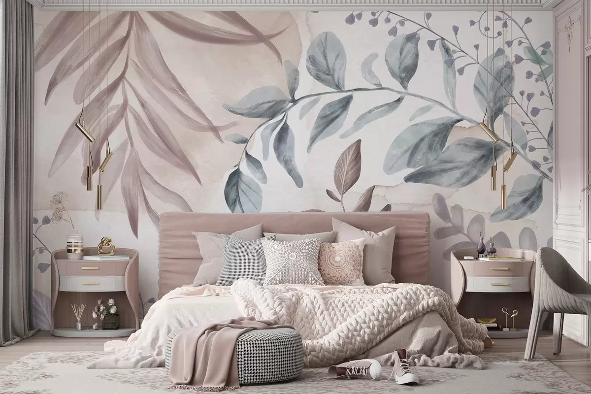 Fototapetes Botāniska izdruka ar lapām un ziedu zariem maigās pasteļkrāsāsās uz akvarelim līdzīga fona Nr. w08668