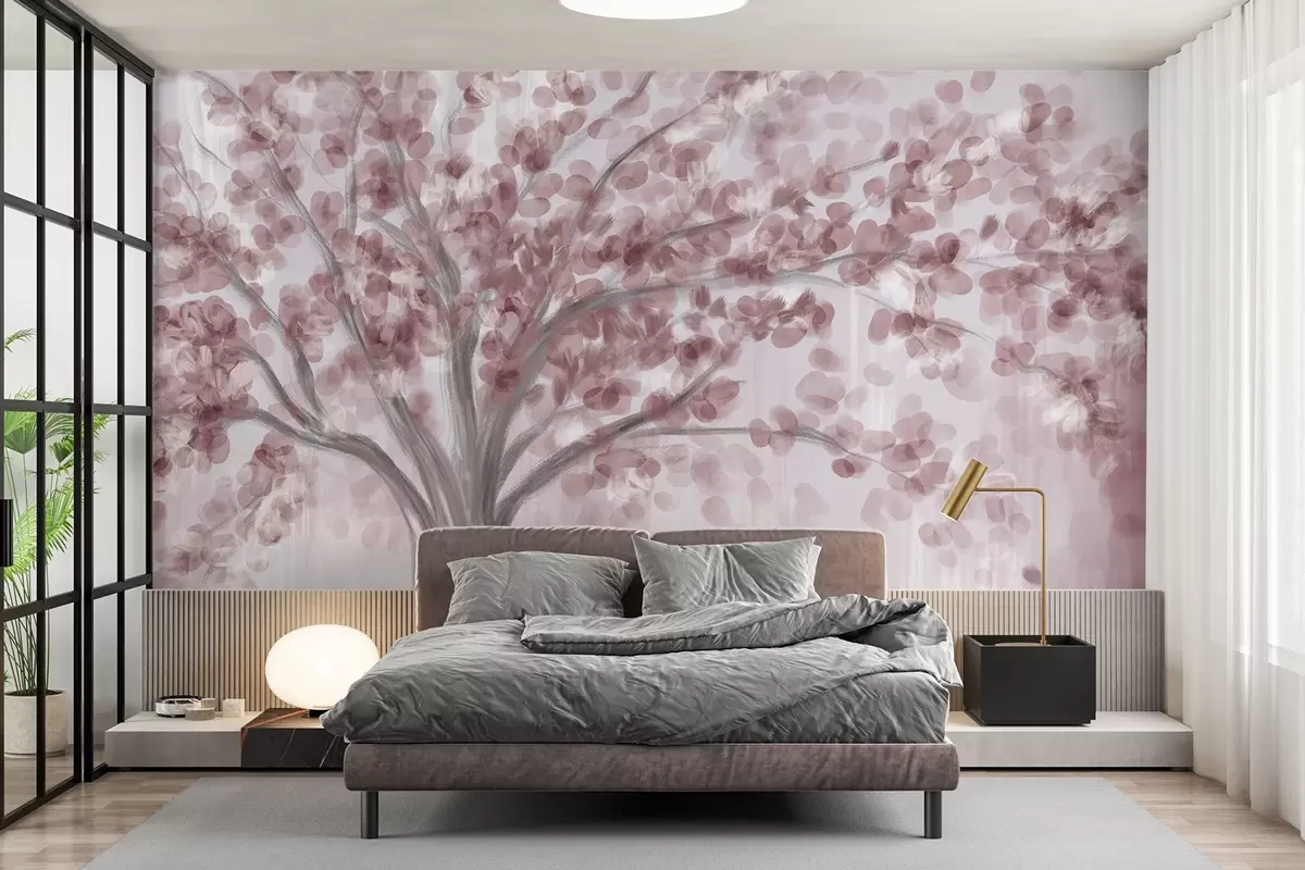Fototapetes Liels koks ar maigām, abstraktām lapām rozā krāsā uz gaiša, neitrāla fona, kas izceļ koka toņus Nr. w08669v2