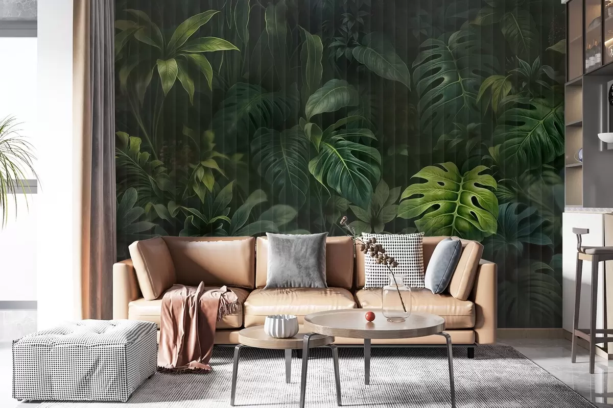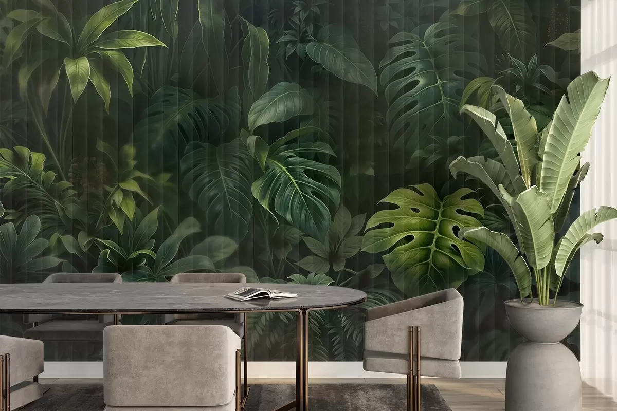Fototapetes Tropu tumši izplūduša un teksturēta apdruka ar dažādām zaļām lapām, tostarp monsteru un palmu lapām Nr. w08673