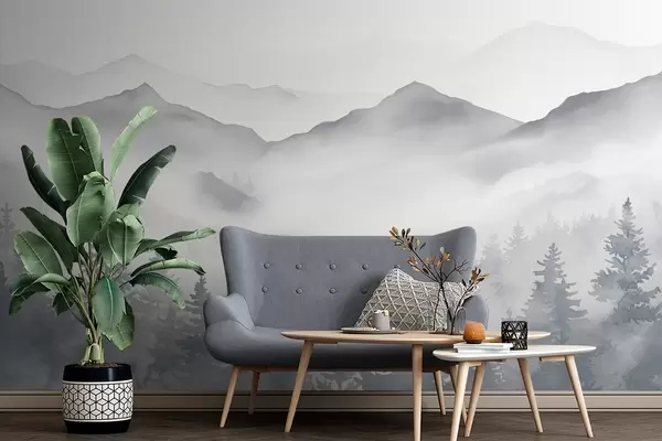 Fototapetes Rāma kalnu ainava ar miglainiem mežiem maigos pelēkos un zilos toņos Nr. w08680