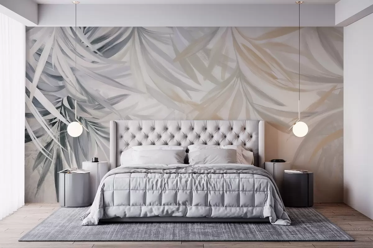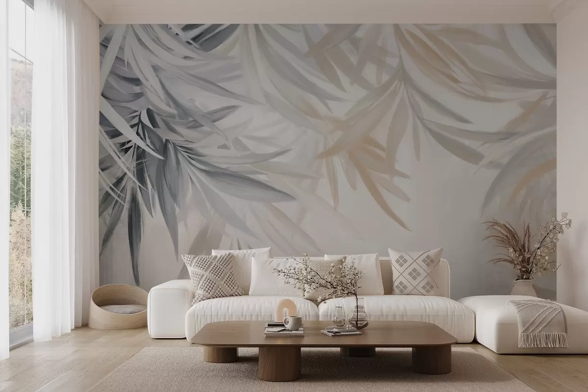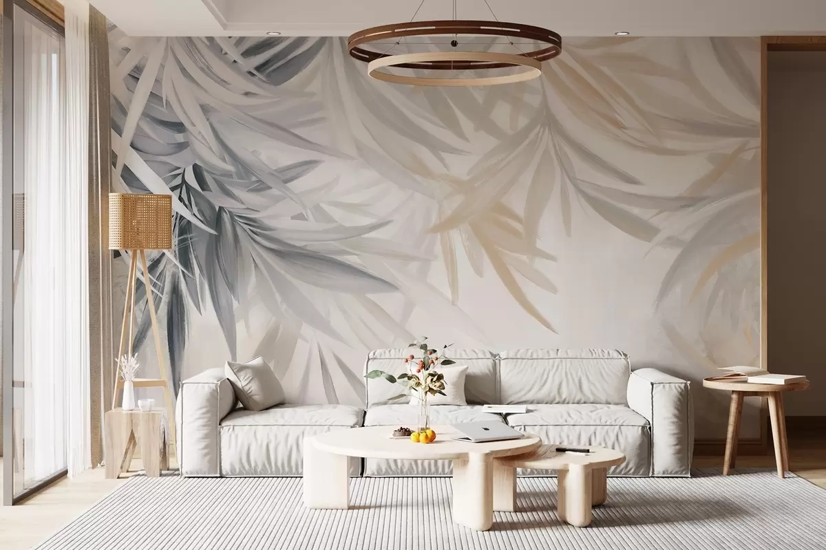 Fototapetes Maigas, plūstošas, gaišas tropu lapas pelēkos un persiku toņos, kas saplūst ar gaišu, neitrālu apdruku Nr. w08703