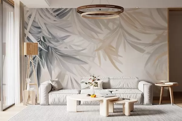 Fototapetes Maigas, plūstošas, gaišas tropu lapas pelēkos un persiku toņos, kas saplūst ar gaišu, neitrālu apdruku Nr. w08703