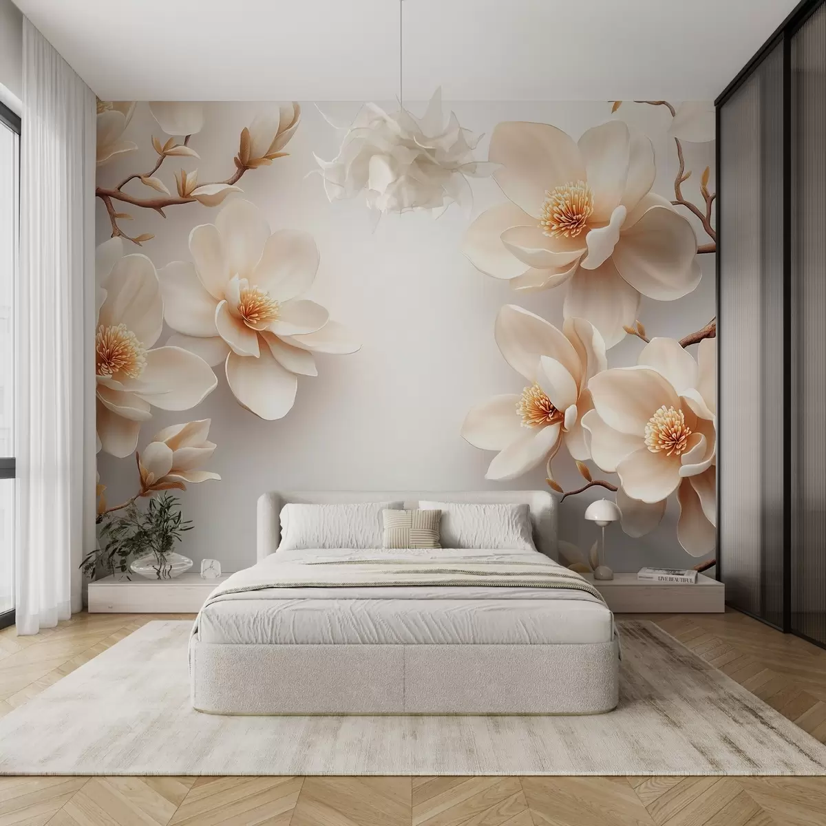 Fototapetes Skaisti ziedoši krēmkrāsas magnolijas ziedi uz balta fona Nr. w08704