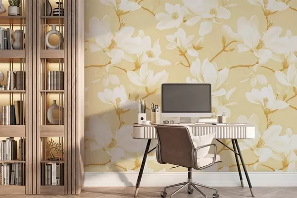 Fototapetes Balta magnolijas ziedu raksts dzeltenos toņos, baltas lapas un zari Nr. w08726v3