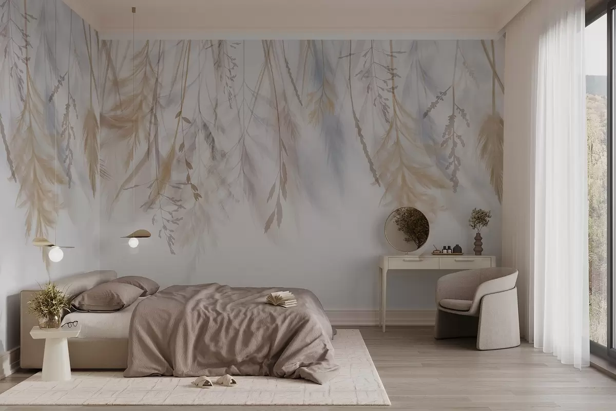 Fototapetes Delikātas pastelto toņu zāles, smaili un augi, kas izkārtoti kaskādes veidā uz gaiša fona Nr. w08737