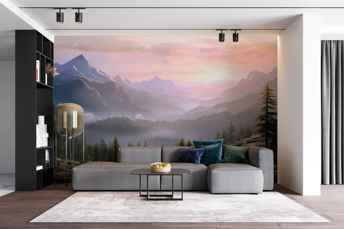 Fototapetes Mierīga kalnu ainava rītausmā ar maigu miglu uz meža fona Nr. w08750