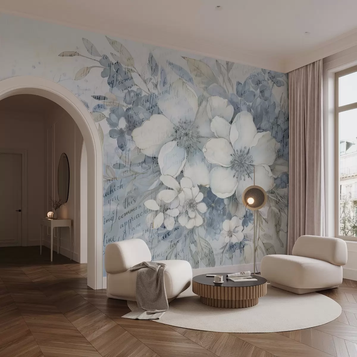 Fototapetes Mīksta sienas imitācija ar tekstūras tekstūru, baltiem un ziliem ziediem, uz gaiša fona ar vāju ar roku rakstītu tekstu Nr. w08771