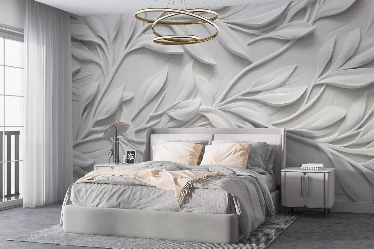 Fototapetes Balta faktūras apdruka ar lapām un zariem, kas veido apjomīgu imitācijas efektu uz faktūras fona Nr. w08778