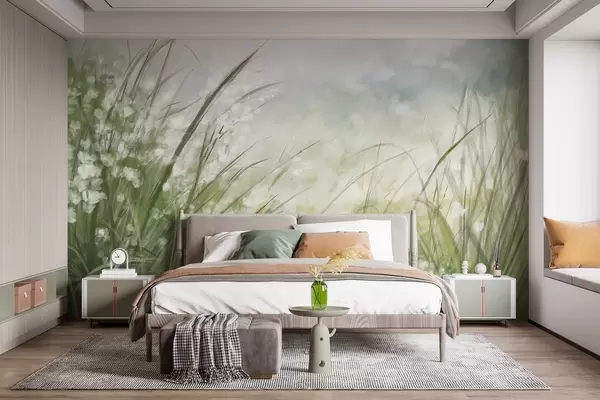 Fototapetes Sulīgi zaļa zāle ar maigi baltiem ziediem, maigi izplūduša druka ar gaišiem toņiem, kas rada mierīgu ainavu Nr. w08779