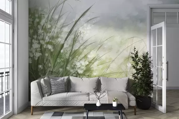 Fototapetes Sulīgi zaļa zāle ar maigi baltiem ziediem, maigi izplūduša druka ar gaišiem toņiem, kas rada mierīgu ainavu Nr. w08779