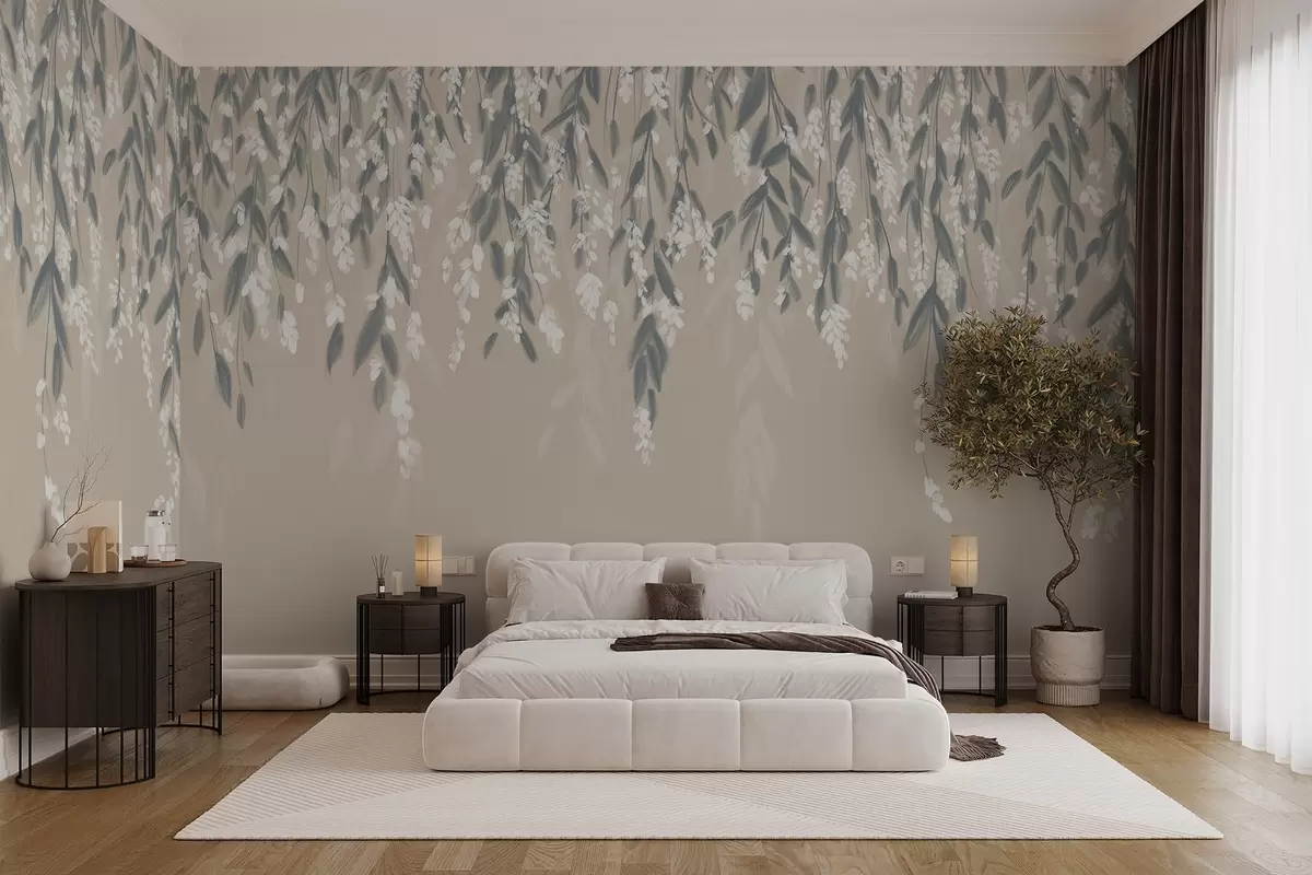 Fototapetes Kaskādes zaļo lapu zari piesmeltā zaļā krāsā ar baltiem ziediem un lapām uz smilškrāsas fona Nr. w08781