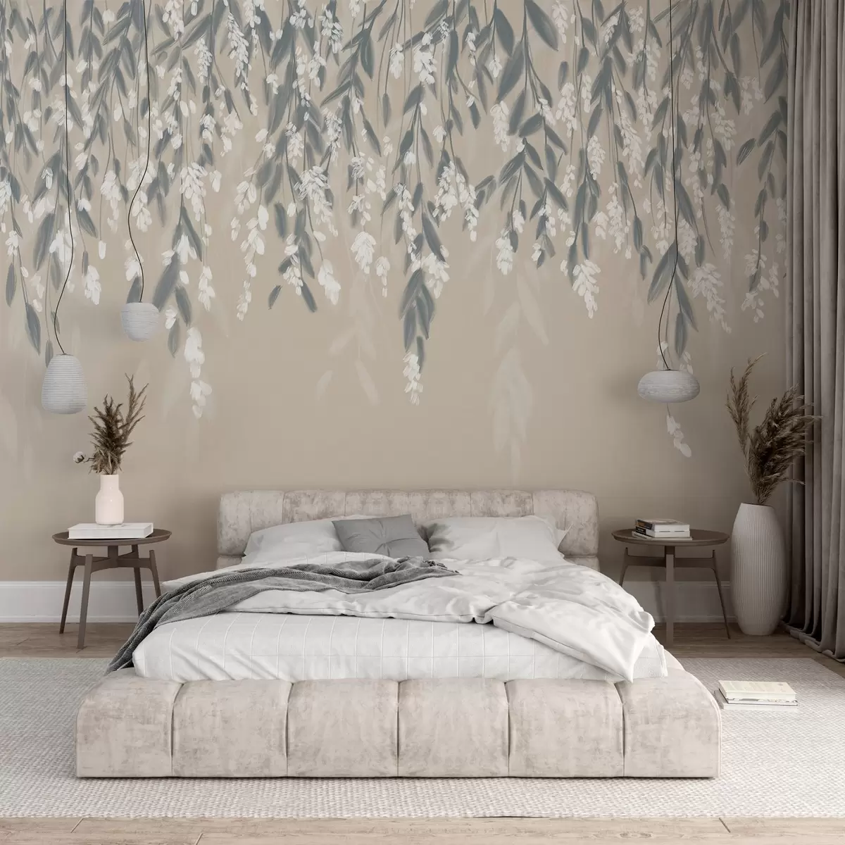 Fototapetes Kaskādes zaļo lapu zari piesmeltā zaļā krāsā ar baltiem ziediem un lapām uz smilškrāsas fona Nr. w08781
