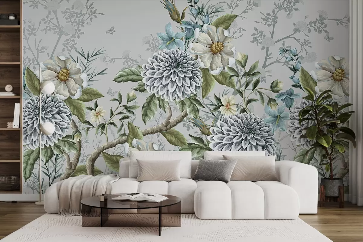 Fototapetes Ziedu apdruka ar krizantēmām, maigi ziliem ziediem un zaļām lapām, kas savijušās ar zariem Nr. w08782