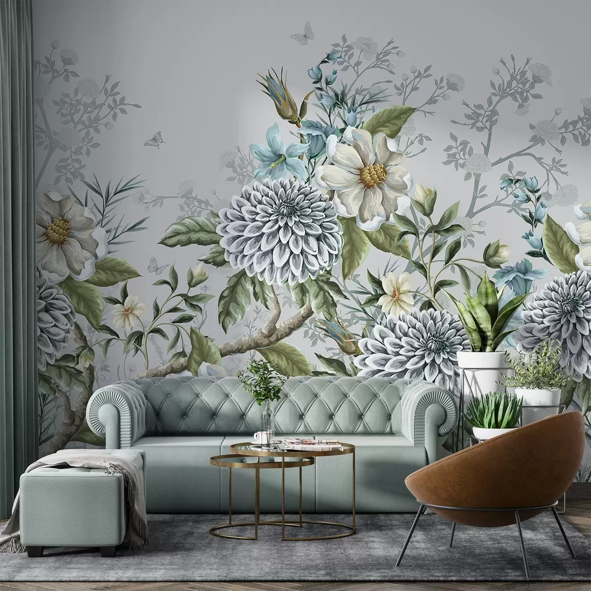Fototapetes Ziedu apdruka ar krizantēmām, maigi ziliem ziediem un zaļām lapām, kas savijušās ar zariem Nr. w08782
