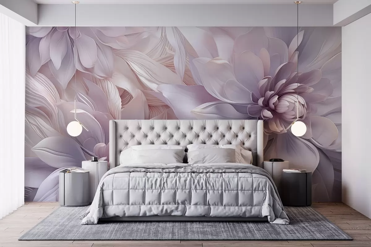 Fototapetes Maigas, daudzslāņainas puķes gaiši rozā, lavandas un baltā krāsā ar maigiem ziedlapiņām un sarežģītām detaļām Nr. w08783