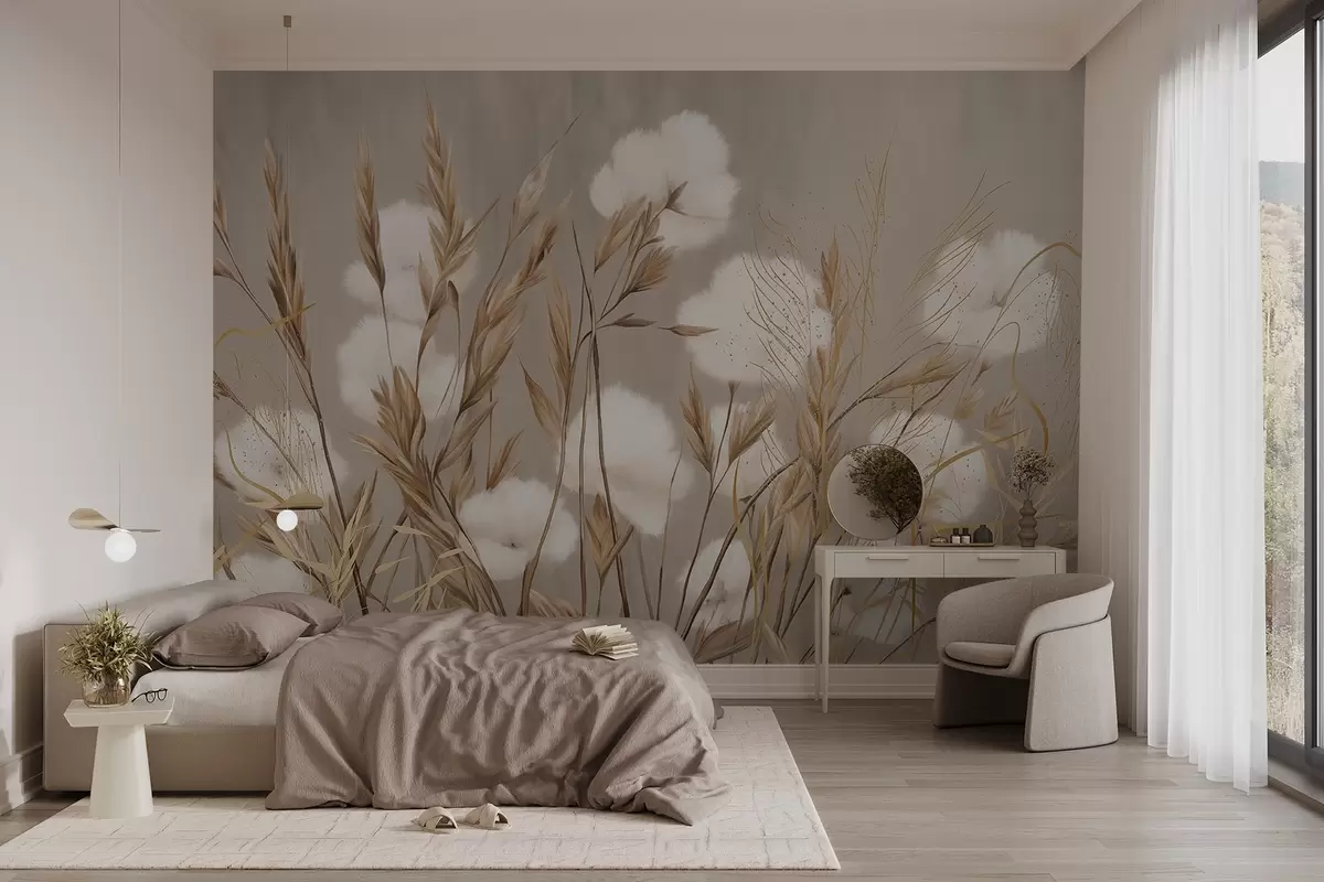 Fototapetes Mīksti, pūkaini kokvilnas balti ziedi un augstas oranžas zālienes uz bēša fona ar pieskaņotu faktūru Nr. w08784