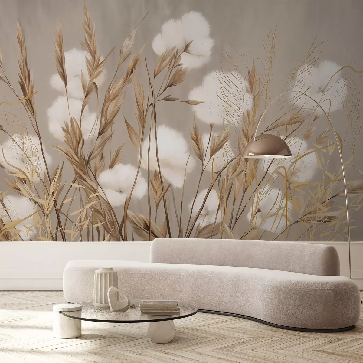 Fototapetes Mīksti, pūkaini kokvilnas balti ziedi un augstas oranžas zālienes uz bēša fona ar pieskaņotu faktūru Nr. w08784