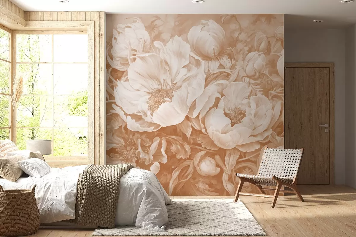 Fototapetes Tulpenes un peonijas, ziedu kompozīcija bēšā eļļas triepienu stilā Nr. w08817v1