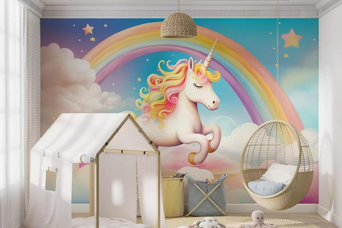 Fototapetes Vienradzis zirgs ar varavīksni, mākoņiem un zvaigžņotām debesīm Nr. w08820