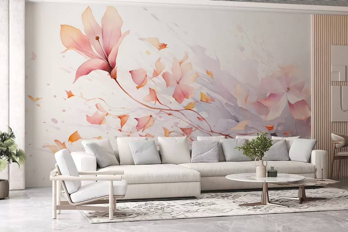 Fototapetes Zieds ar krītošām ziedlapiņām, kas plīvo vējā akvareļu stilā Nr. w08821