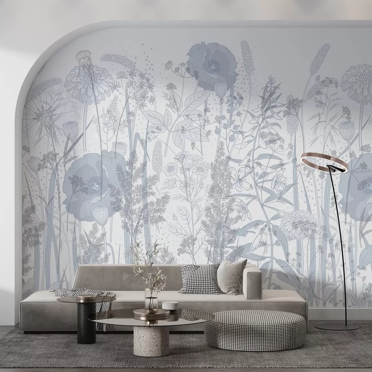 Fototapetes Augstu ziedu un zāles lauks gaiši zilos pasteļtoņos uz balta fona Nr. w08829