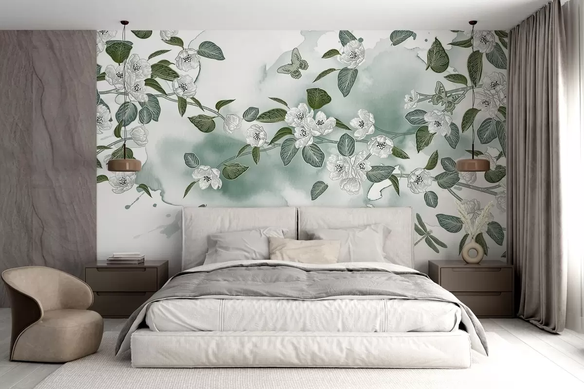 Fototapetes Ķiršu koku ziedu zars ar ziediem, lapām, tauriņiem uz gaiši zaļa akvareļa tekstūras fona Nr. w08831