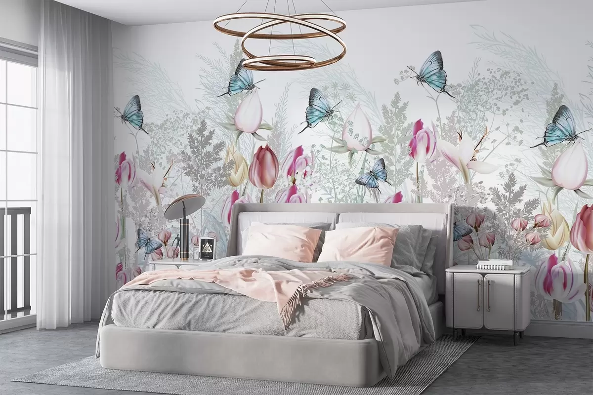 Fototapetes Pasteļdruka ar tulpju ziediem, zāli un dārzā lidojošiem tauriņiem Nr. w08834