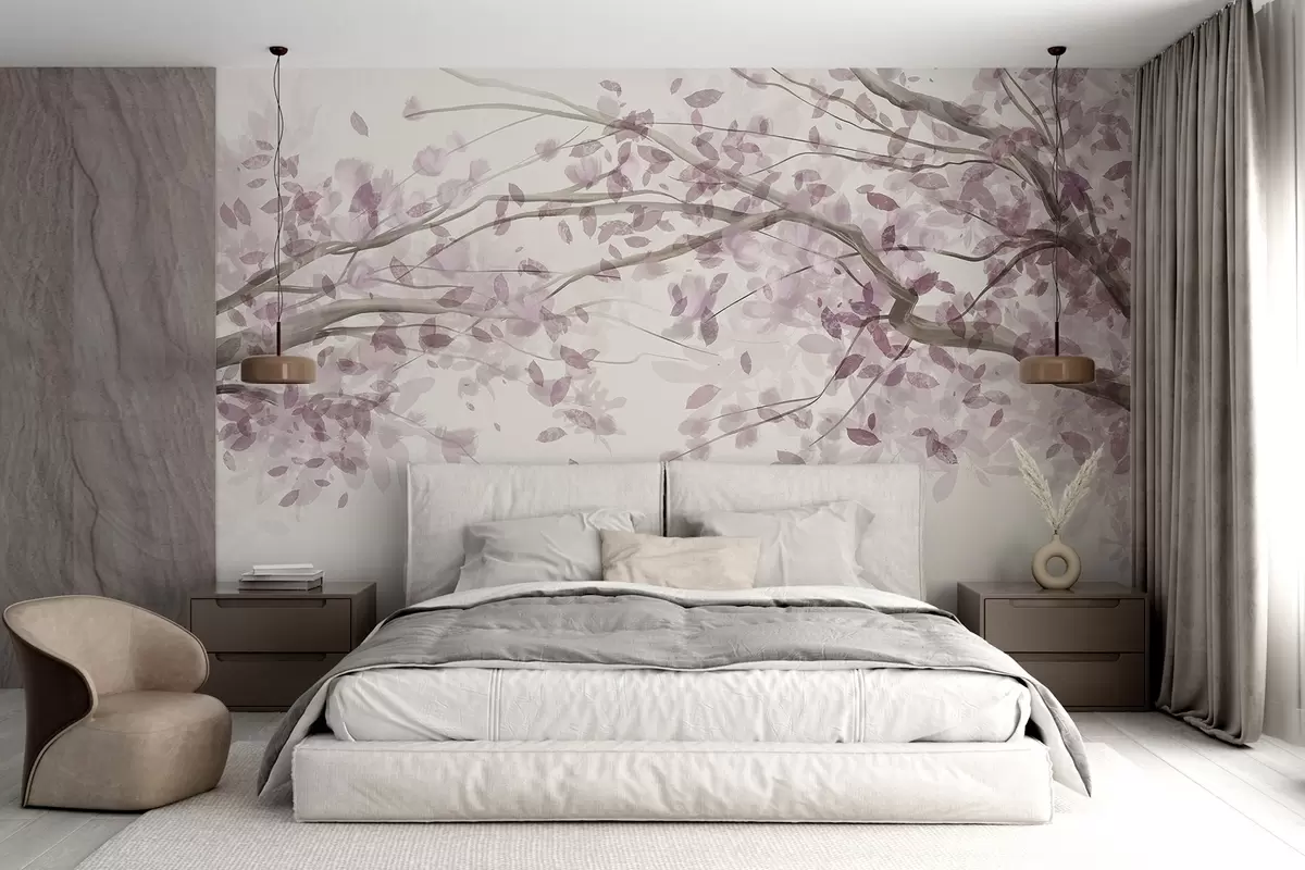 Fototapetes Ziedu zari ar rozā lapām, maigas krāsas, maigas detaļas, akvareļa stilā, uz gaiša fona w08867