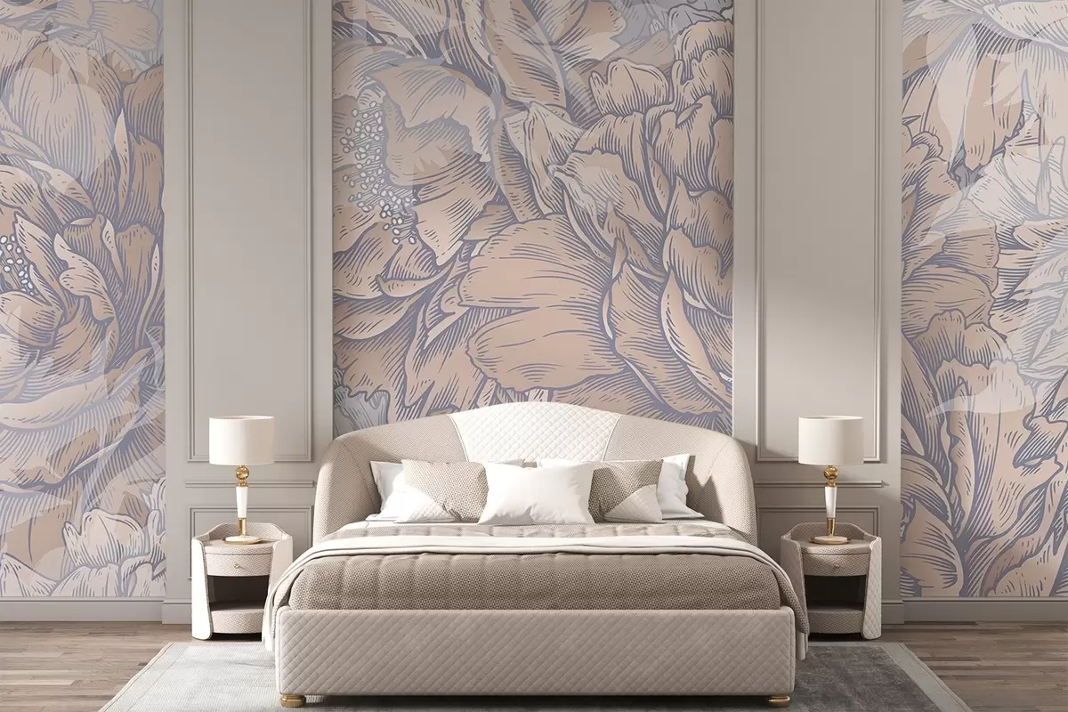 Fototapetes Peoniju ziedi ar detalizētiem ziedlapiņām un kociņiem, maigas pasteļkrāsas, vintage botāniskās ilustrācijas stils Nr. w08890