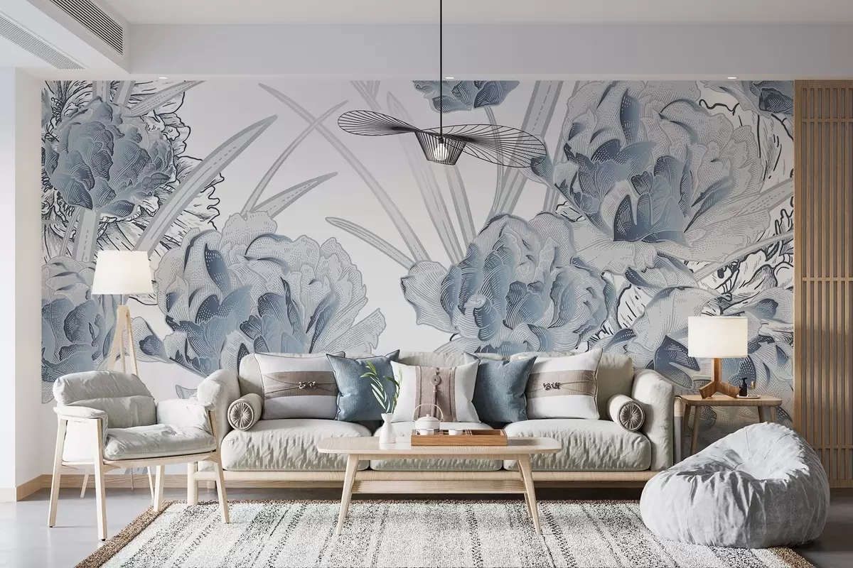 Fototapetes Zilas peonijas ar lapām uz balta fona, ziedu dizains, botāniska ilustrācija  w08896
