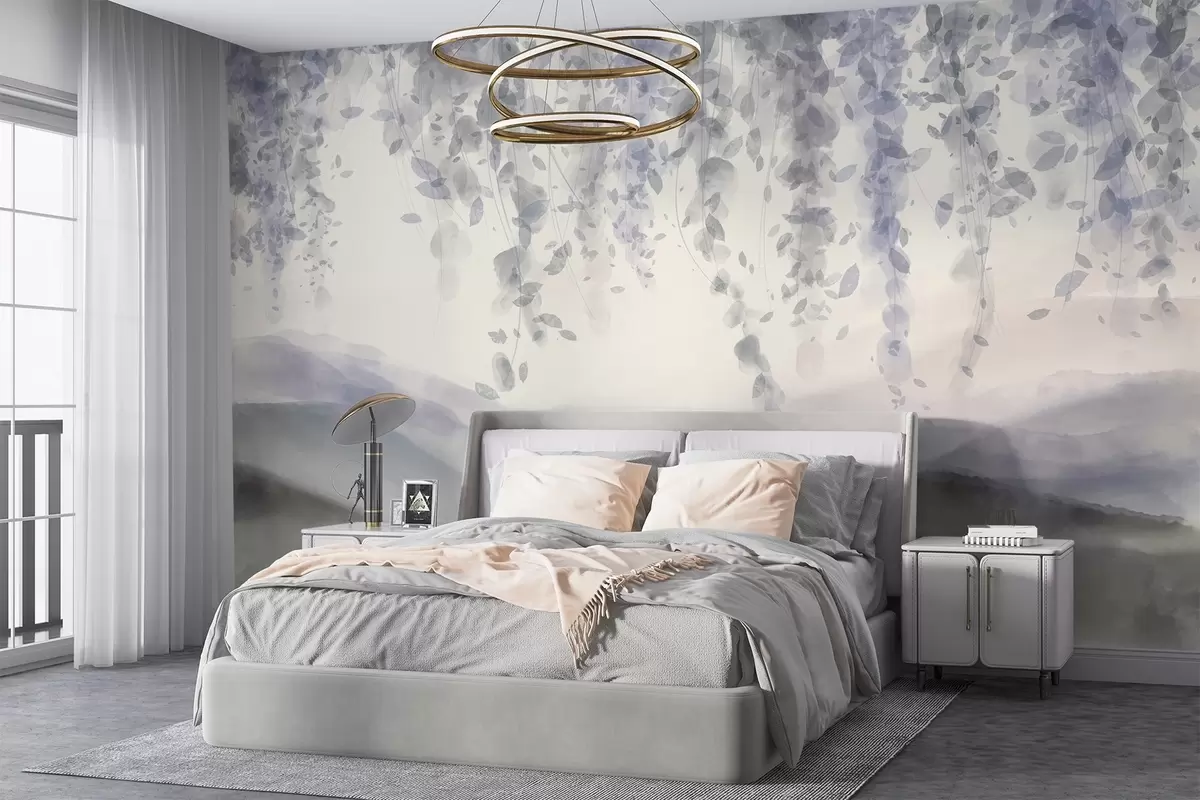 Fototapetes Vistērijas lapas, kas karājas pār zilgani kalniem, maigas pasteļzilas un pelēkas krāsas, akvareļa stila ainava Nr. w08909