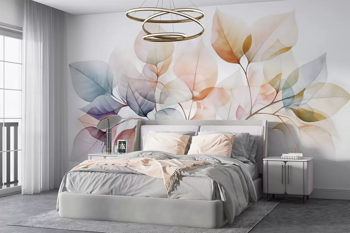 Fototapetes Akvareļglezniecība ar caurspīdīgām lapām pasteļtoņos, rozā, baltā, violetā un zilā krāsā Nr. w08910