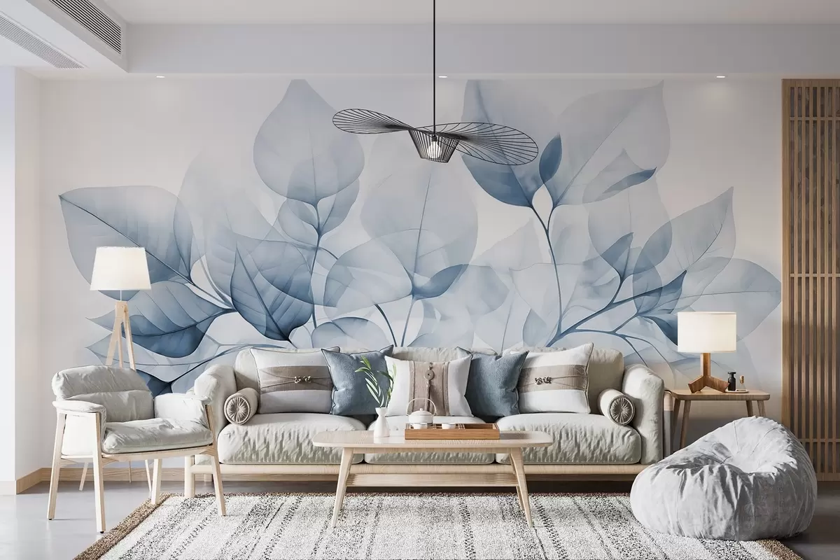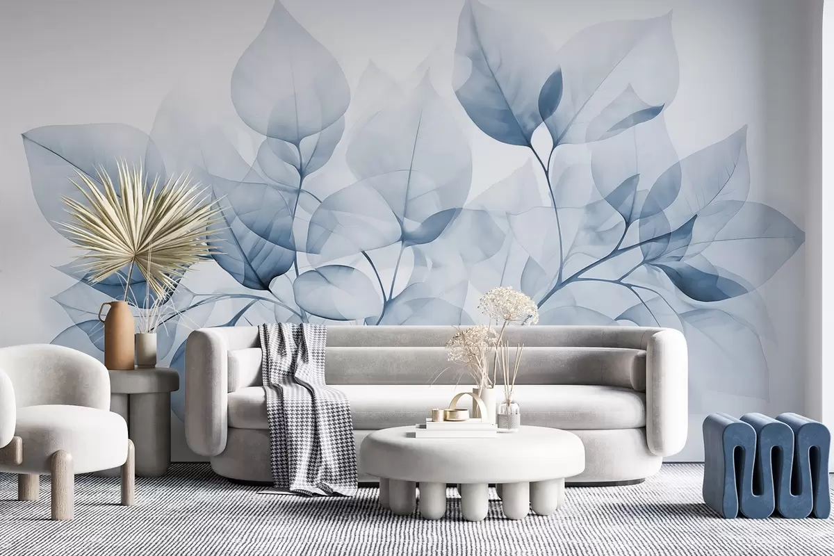 Fototapetes Caurspīdīgu lapu akvareļglezniecība pasteļtoņos ar baltiem un ziliem toņiem Nr. w08910v1