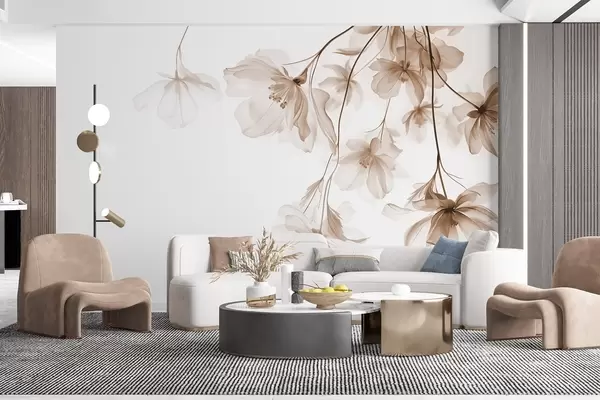 Fototapetes Smilškrāsas ziedi ar caurspīdīgām ziedlapiņām, kas karājas no zara, smilškrāsas un balta, minimālisma modernās mākslas kompozīcija Nr. w08911v1