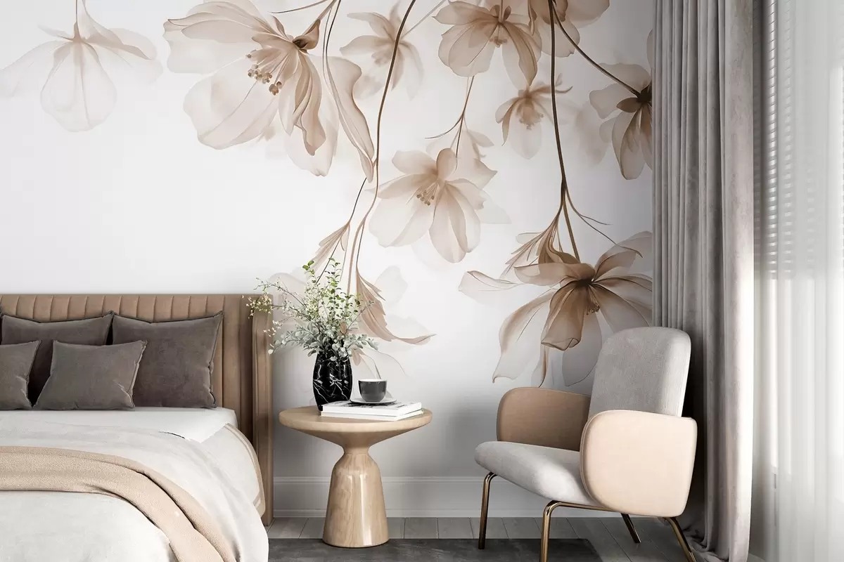 Fototapetes Smilškrāsas ziedi ar caurspīdīgām ziedlapiņām, kas karājas no zara, smilškrāsas un balta, minimālisma modernās mākslas kompozīcija Nr. w08911v1