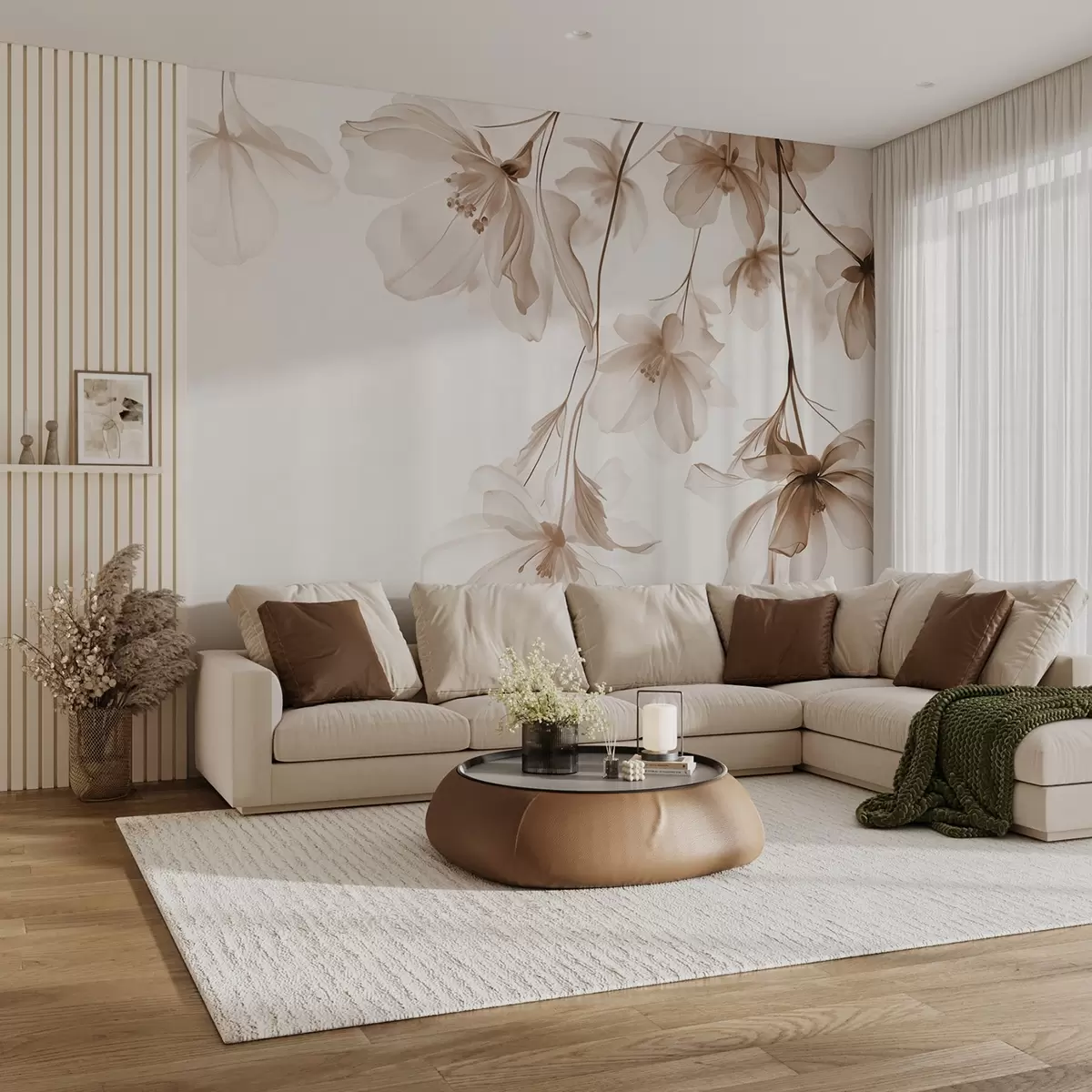 Fototapetes Smilškrāsas ziedi ar caurspīdīgām ziedlapiņām, kas karājas no zara, smilškrāsas un balta, minimālisma modernās mākslas kompozīcija Nr. w08911v1