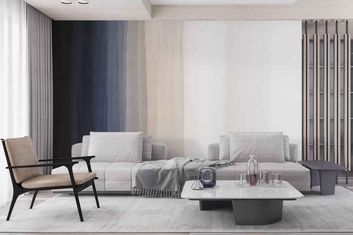 Fototapetes Abstrakta minimālistiska gradientu apdruka ar vertikālām tumši zilas, gaiši persiku un baltas krāsas svītrām Nr. w08915v1