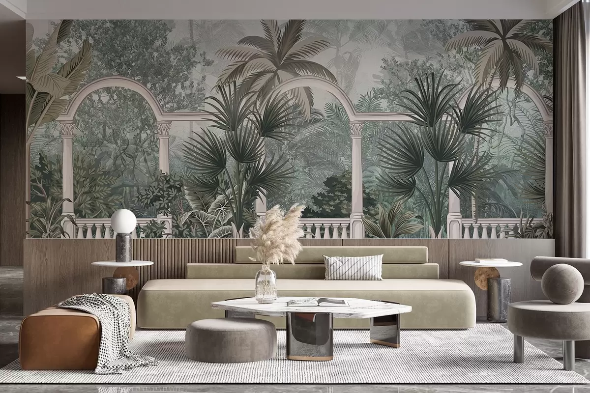 Fototapetes Tropu tekstūras dārzs ar palmām un sulīgu veģetāciju, balustrādes ar arkām, pieklusinātas krāsas, vintage stils Nr. w08916