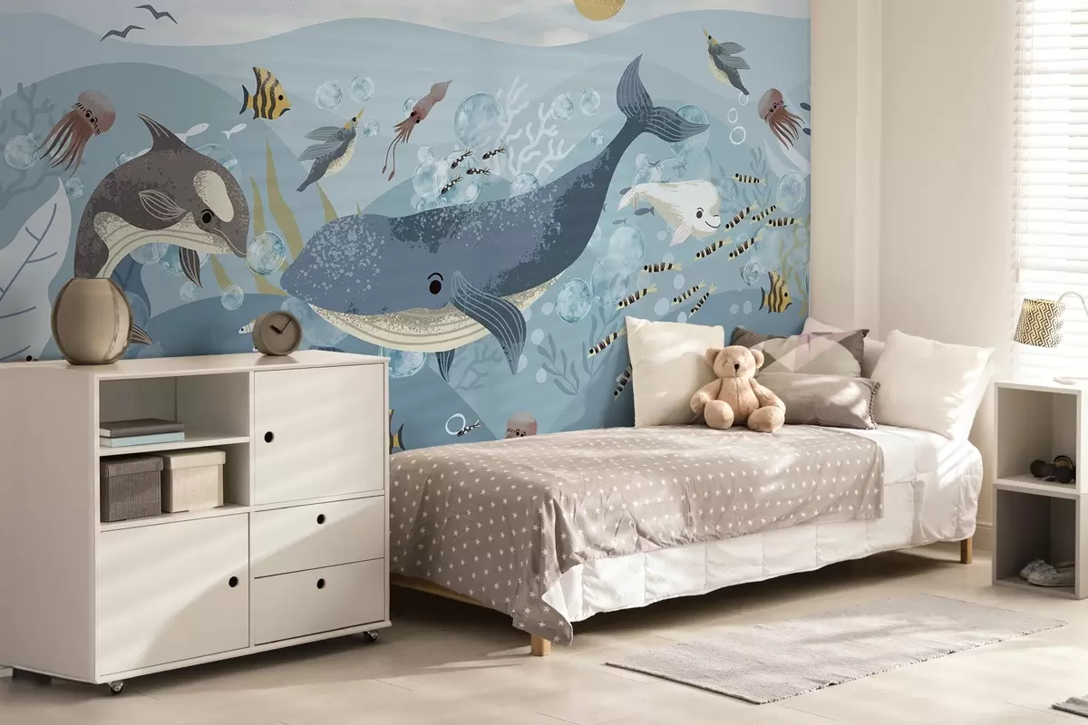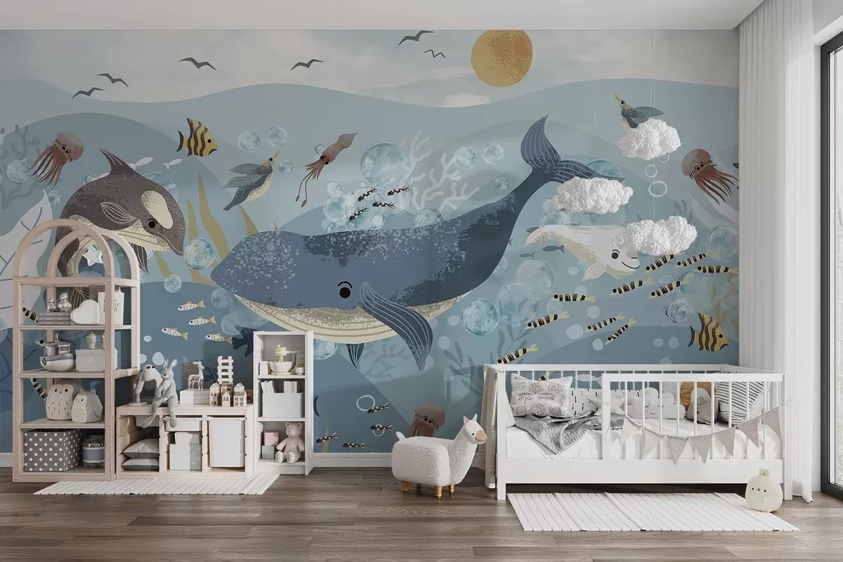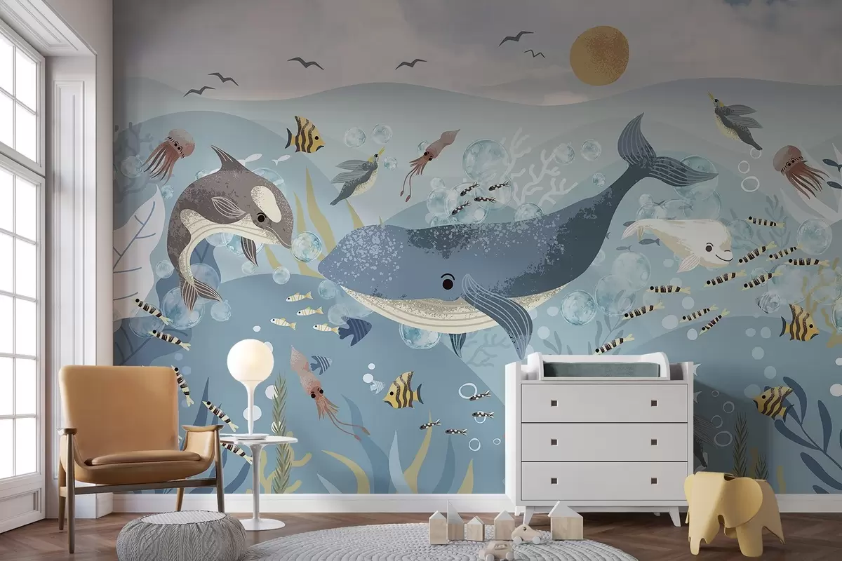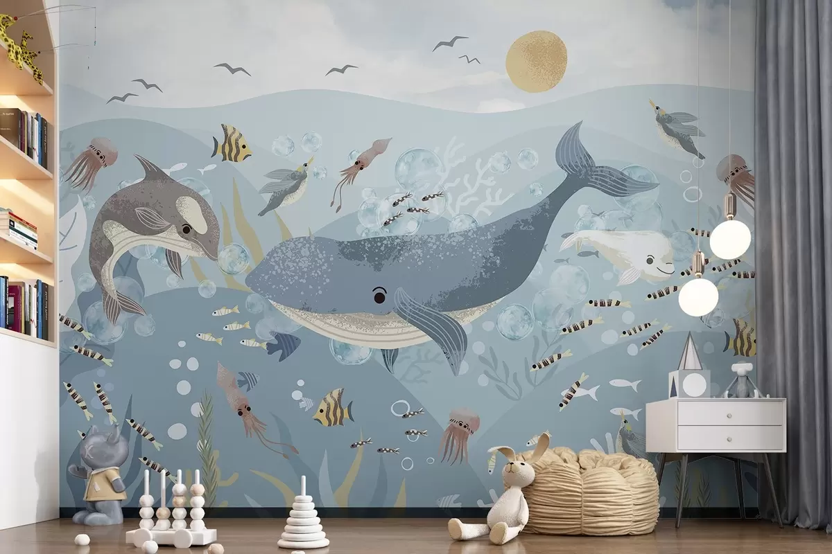 Fototapetes Bērnu ilustrācija gudrs izdruka ar zilu valis ieskauj zivis, kalmāri, medūzas zilā okeānā ar burbuļiem Nr. w08921
