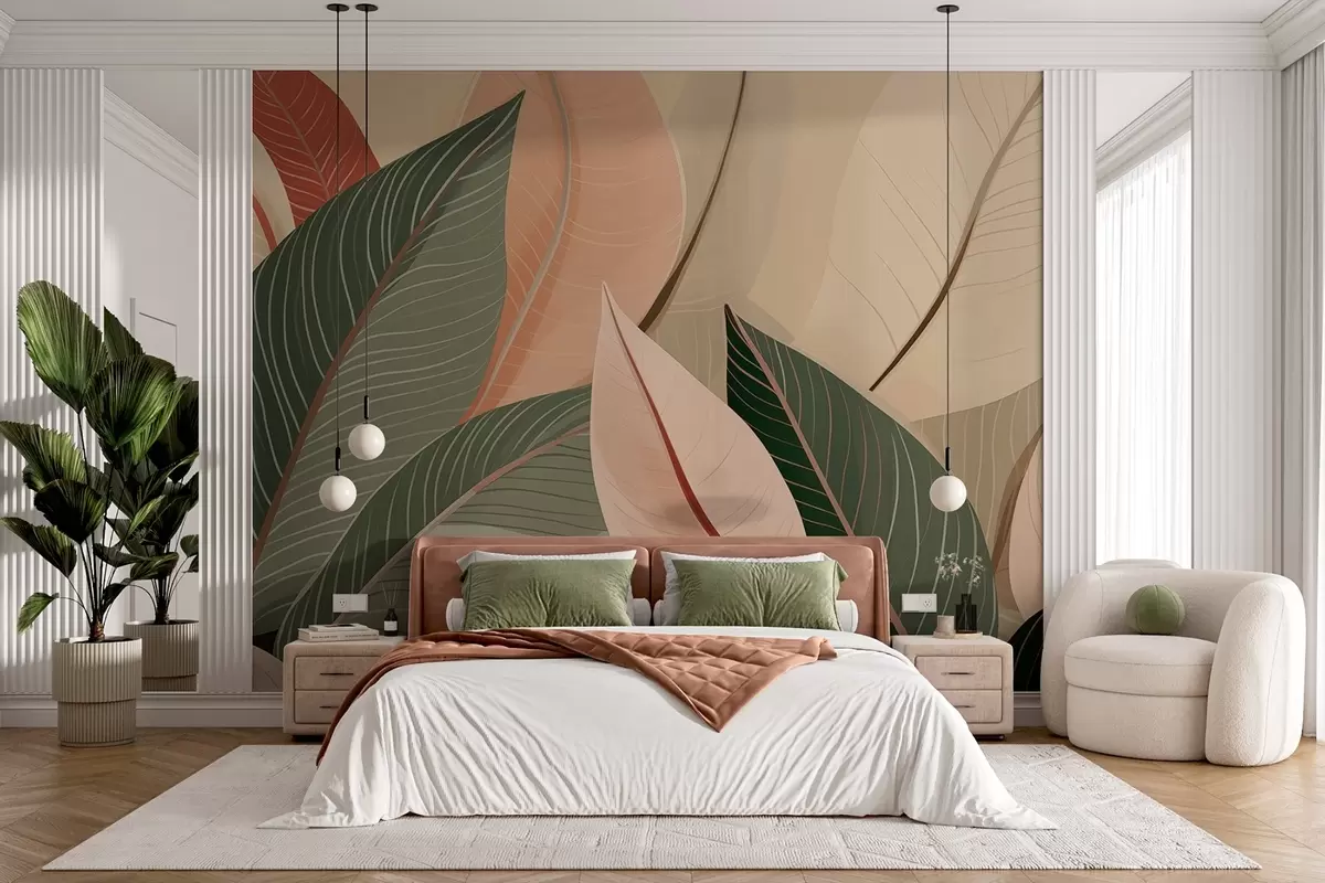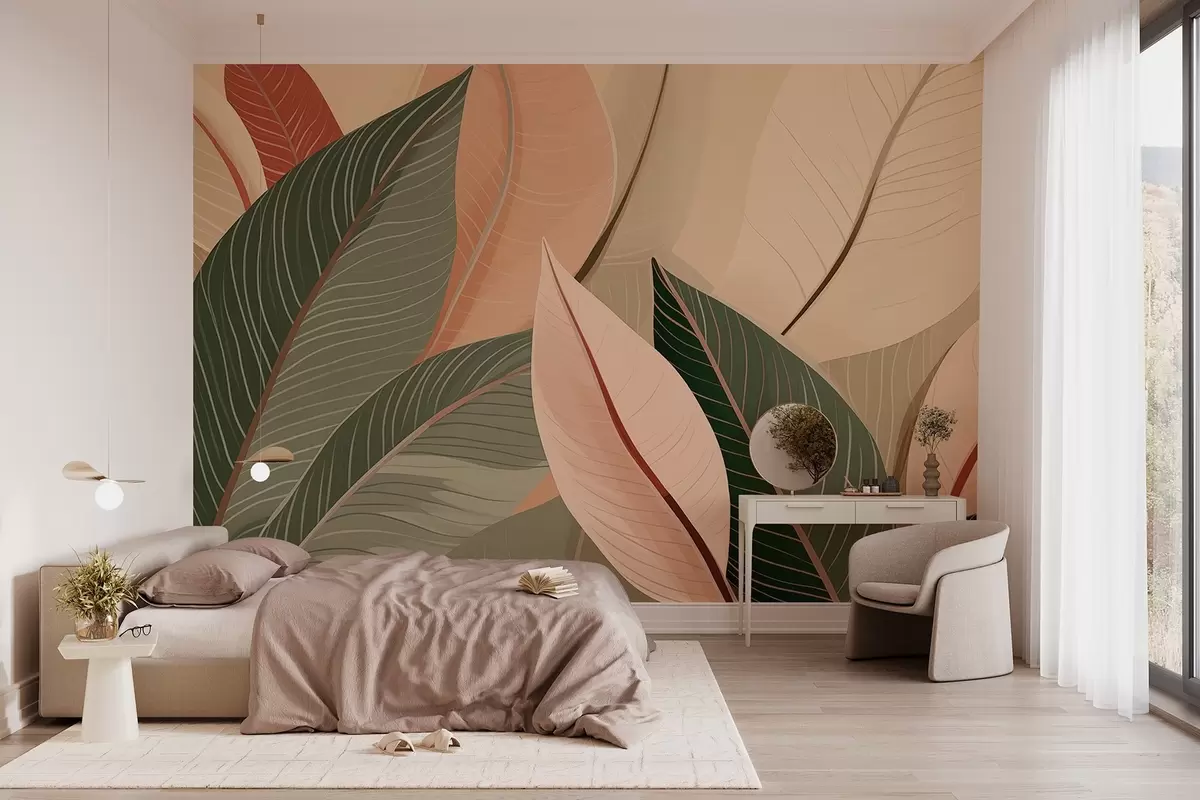 Fototapetes Lapu tuvplāns olīvu zaļā un rozā krēmkrāsas krāsās Nr. w08944