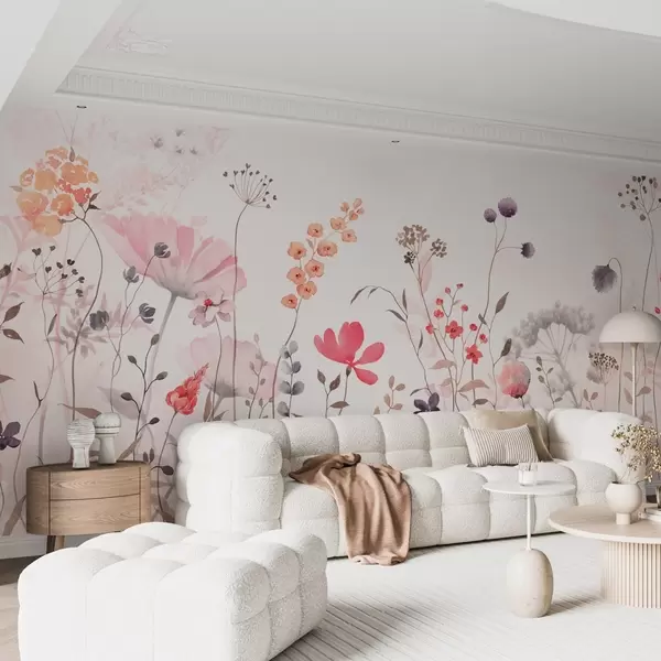Fototapetes Akvareļa stila savvaļas puķes ar magonēm, krizantēmām, pienenēm un zāli w08956