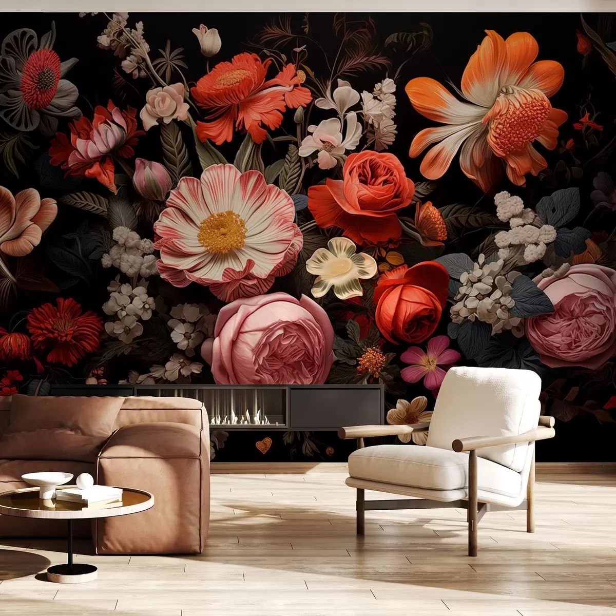 Fototapetes Krāsains dažādu ziedu pušķis uz tumša fona siltos toņos Nr. w08969