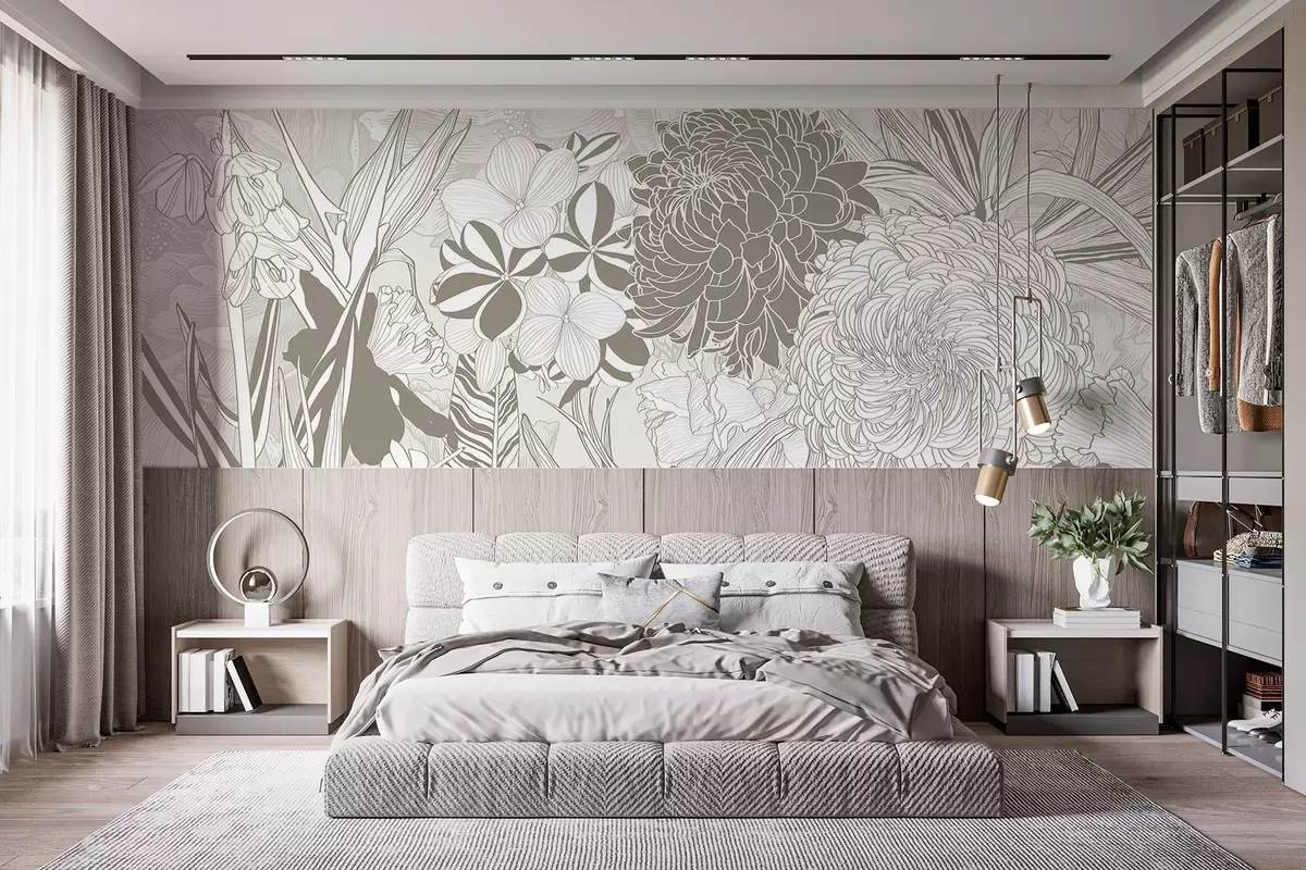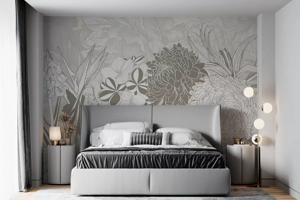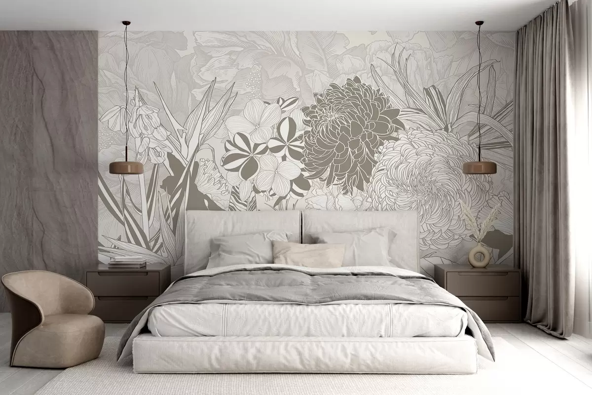 Fototapetes Ziedi un lapas smilškrāsas toņos, tostarp krizantēmas, plumērijas un tropu zaļumi, botānisks dizains Nr. w08976