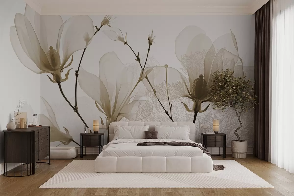 Fototapetes Caurspīdīgi smilškrāsas magnolijas ziedi ar ziedu siluetiem ar maigiem ziedlapiņām un tumšiem kātiņiem Nr. w08978v1