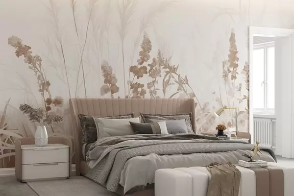 Fototapetes Brūni ziedi un smilškrāsas niedres laukā, minimālisma glezniecības tekstūra, viegls fons, maigas krāsas, maigi triepieni ar otu Nr. w08982v1