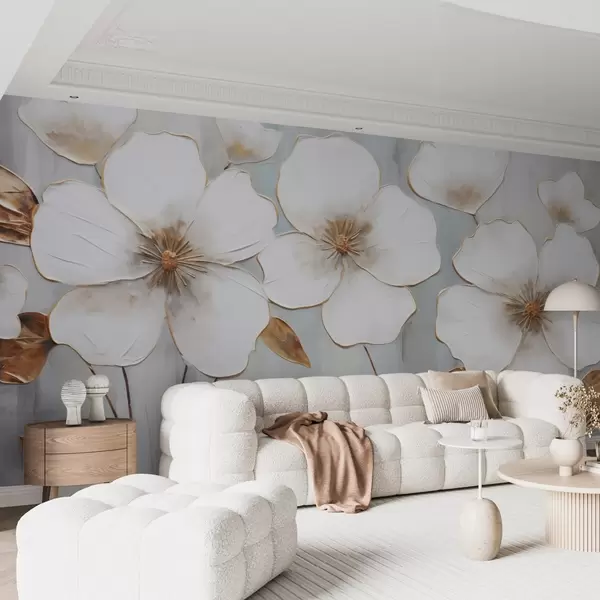 Fototapetes Lieli balti ziedi ar dzeltenām akcenta lapām uz pelēka fona Nr. w08999