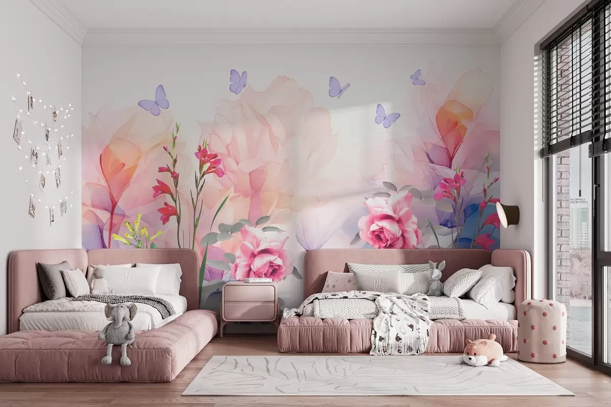 Fototapetes Ziedi ar tauriņiem un rozēm akvareļu stilā Nr. w09002