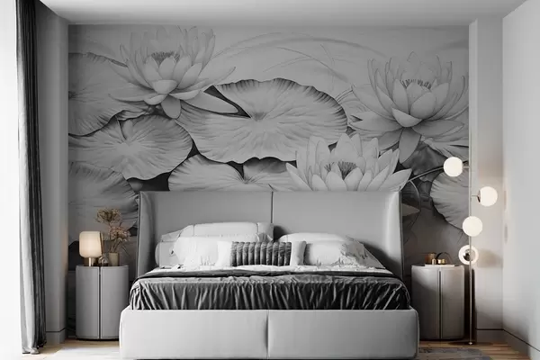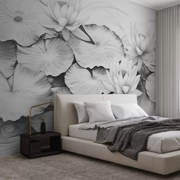 Fototapetes Ūdensrozes un lilijas dīķī, melnbalta zīmuļa zīmējuma imitācija, detalizēta botāniskā ilustrācija, dabas māksla Nr. w09006