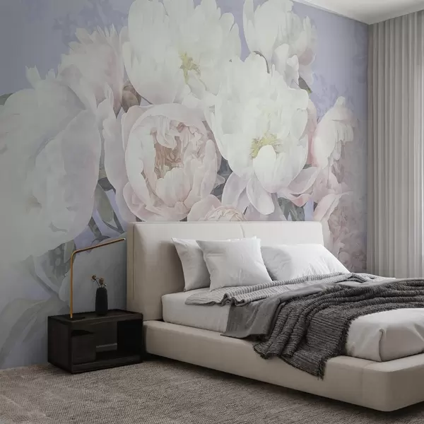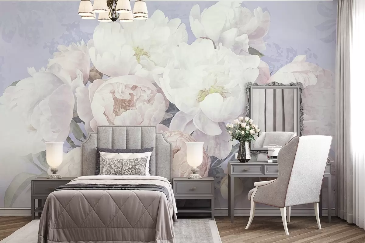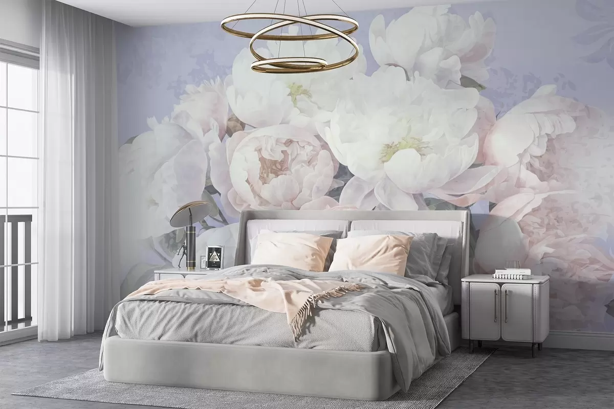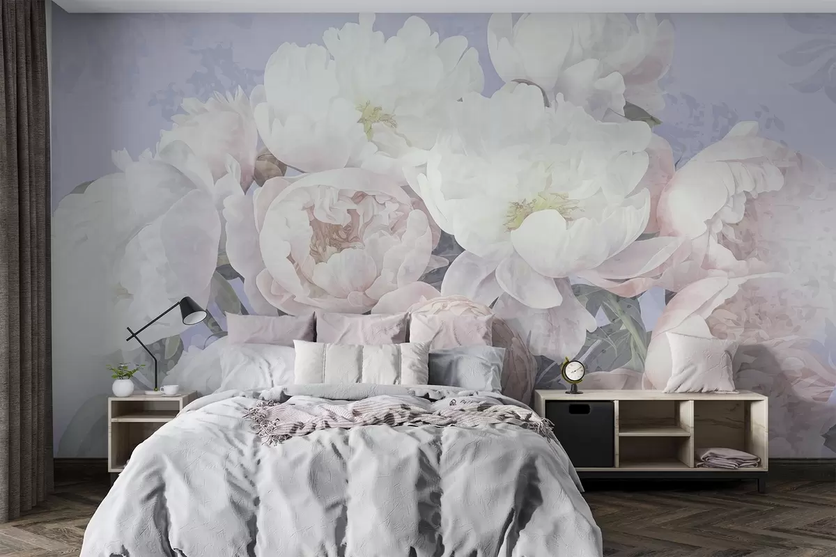Fototapetes Teksturētas abstraktas persiku un baltas peonijas ar zaļām lapām, viegls fons, maigas un maigas krāsas, vintage stils Nr. w09008v1